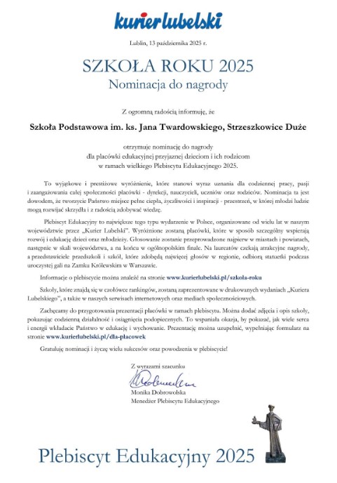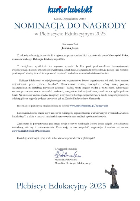 Z radością informujemy, że nasza szkoła została nominowana w Plebiscycie Edukacyjnym 2025 Kuriera Lubelskiego w kategorii „Placówka najbardziej przyjazna uczniom i rodzicom”.